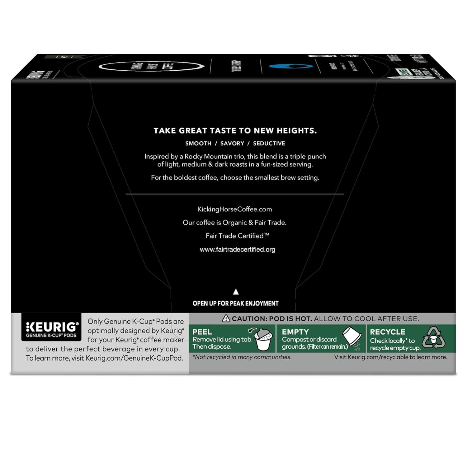 The kickass coffee your Keurig coffee maker has been waiting for! Great taste hits new heights with our Three Sisters medium roast coffee blend, which owes both its name and its uncompromising taste to our impressive roots. Because we believe that when you drink mountains, you can move mountains — just like the towering trio known as the Three Sisters. We pay homage to these powerful peaks with a triple punch of light, medium, and dark roasts in every Three Sisters K-Cup pod. Beans from Central and South America combine to create a full-bodied medium roast blend brimming with a complexity highlighted by notes of stone fruit and cocoa. And the inviting aroma of dried fruit, toasted coconut, and milk chocolate makes this a smooth, savory, and seductive medium roast coffee. For the boldest coffee in your cup, brew on the smallest cup size. In the middle of nowhere in the Rocky Mountains, Kicking Horse Coffee was born. And it was born kicking. Kicking for purpose, quality, what’s right, and what’s fair. And since then, they haven’t stopped kicking. This coffee is proudly certified Fair Trade and organic, and a deliciously bold kick in the you-know-where. Always was and always will be. Wherever you are in the world, wake up and kick ass with Kicking Horse Coffee. Each Kicking Horse Coffee Three Sisters K-Cup pod is filled with premium, freshly ground coffee beans and is compatible with all Keurig single serve coffee makers. Simple. Delicious. And recyclable.* Enjoy the same great-tasting coffee you know and love, and when you’re done, just peel, empty, and recycle. *Check locally, not recycled in many communities.