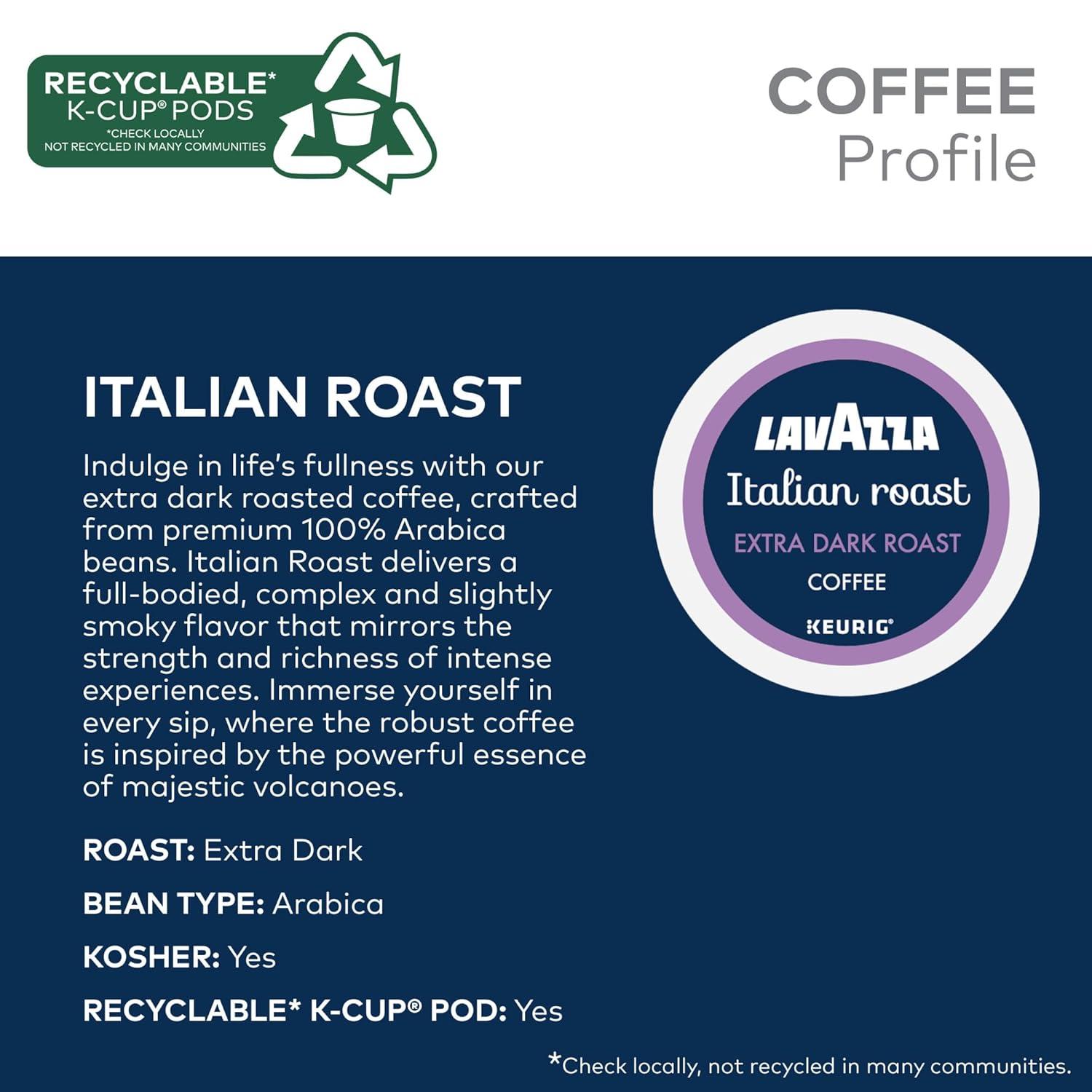 No matter how you take your coffee, Lavazza has a blend and preparation to perfectly fit into your coffee ritual. This Lavazza K-cup Variety Pack includes: 16 K-cup pods of Lavazza Costiera (Gran Aroma Light Roast), 16 K-cup pods of Lavazza Dolcevita (Classico Medium Roast), 16 K-cup pods of Lavazza House Blend (Perfetto Medium Roast), and 16 K-cup pods of Lavazza Italian Roast (Extra Dark Roast). These blends allow for a variety of delightfully sippable cups of coffee using a Keurig Brewer. Enjoy a premium experience where every small moment can be savored. Four generations of the Lavazza family have dedicated over 125 years to sourcing the best blends of coffee beans from all over the world to bring you an unmistakable taste and aroma that is uniquely Lavazza.